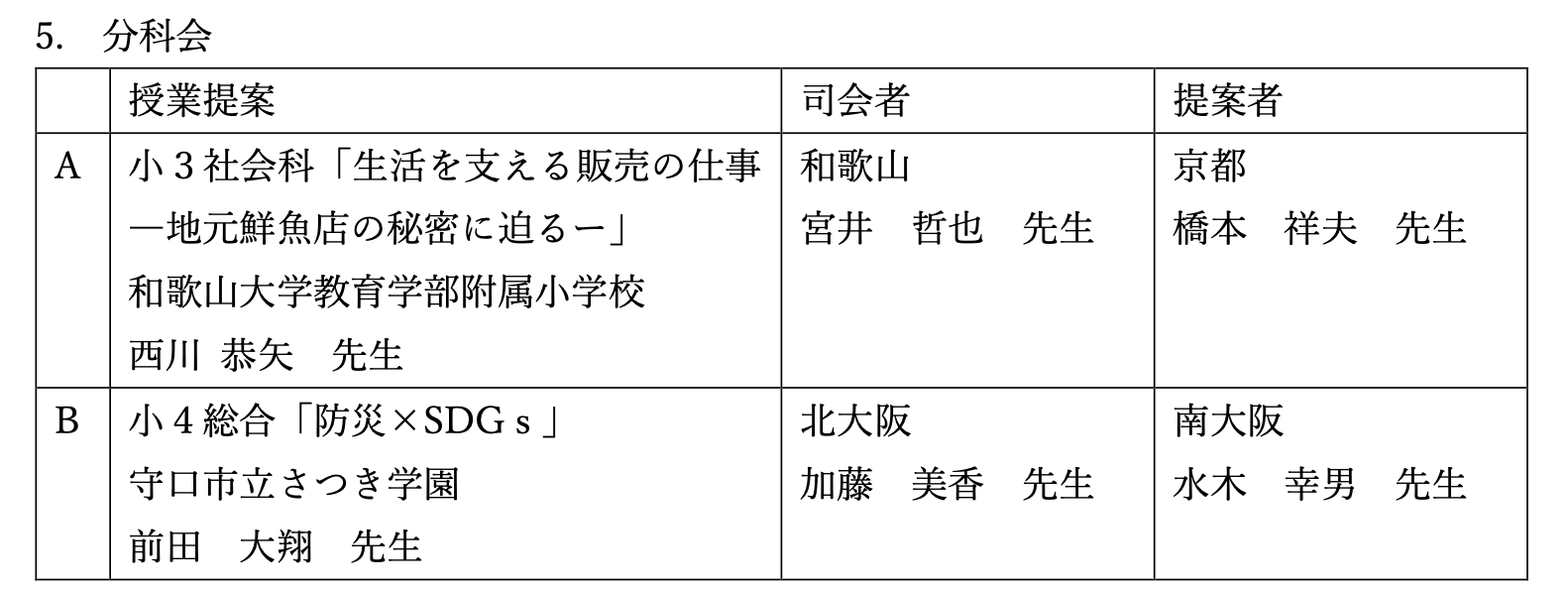 | A | 小3社会科「生活を支える販売の仕事―地元鮮魚店の秘密に迫るー」 和歌山大学教育学部附属小学校 西川 恭矢 先生 | 和歌山 宮井 哲也 先生 | 京都 橋本 祥夫 先生 |
